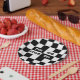 Get your party supplies together to celebrate a 40th birthday party or fortieth milestone anniversary with paper plates featuring a bold black and white checkered pattern with the words "The Big Four Oh" in alternating white on black and black on white text.
