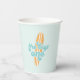 The Big One! Surfing Beach 1st Birthday party paper cups with turquoise waves and orange surf board.