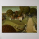 Painted in 1931 by renowned American Regionalist Grant Wood, The Birthplace of Herbert Hoover depicts the modest white frame cabin in West Branch, Iowa, where the 31st U.S. president was born. Executed in oil on masonite, this large-scale work (approximately 75 x 101 cm) captures the rural Midwestern landscape with Wood’s characteristic precision and stylized simplicity, emphasizing geometric forms and rhythmic patterns. The painting features warm autumnal tones and a bird’s-eye perspective, highlighting the contrast between the small cabin and the larger house in front, as well as the orderly trees and path. A small figure points toward the birthplace, guiding the viewer’s attention and adding a narrative element. Commissioned by Iowa businessmen as a tribute to Hoover, the painting reflects both pride in local heritage and Wood’s mastery of American folk art-inspired Regionalism. It is part of the Minneapolis Institute of Art collection.