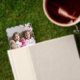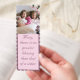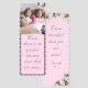 Design front features the photo you supply as top image. Bottom displays your message in a burgundy font against a light pink background and framed with a burgundy border. The image of a pink and white floral bouquet graces the top corner.