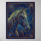Poster of a horse's head in close-up, rendered with delicate yellow, blue, and orange lines on a dark blue background. Abstract vector fractal, wave function, Zentangle style, with subtle 3D shading and glowing bioluminescent elements. Cinematic lighting, inspired by the intricate patterns of Ernst Haeckel and the fluid lines of Alphonse Mucha.
