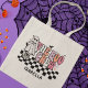 The Boo Crew Cute Ghost Halloween Personalized Name Tote Bag features the text "The Boo Crew" in modern pink, purple, orange and white script typography accented a groovy ghost on a checkerboard floor with bats and personalized with your custom name. Perfect for Halloween gift bags, Halloween parties, personalized trick or treat bags and more. Designed by Evco Holidays www.zazzle.com/store/evcoholidays