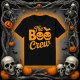 Rally your friends and family for the spooky season with "The Boo Crew" design! This classic graphic features bold black lettering against a vibrant Halloween orange background. The word "Boo" is stylized with the "O"s replaced by menacing jack-o'-lantern faces, and a flying bat is perched above the text. With a mix of script and block fonts, this is a fun, essential design for your entire Halloween squad. It's perfect for trick-or-treating, fall festivals, classroom parties, or just celebrating the haunted holidays together.