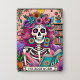Vibrant, colorful design featuring a funny tarot card with a female skeleton. The skeleton has wild pink hair with flowers in it, a sugar skull face, and is holding a open book. The colorful text reads: "The bookworm". This design is available on a wide variety of products.