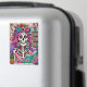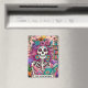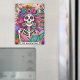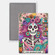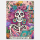 Vibrant, colorful design featuring a funny tarot card with a female skeleton. The skeleton has wild pink hair with flowers in it, a sugar skull face, and is holding a open book. The colorful text reads: "The bookworm". This design is available on a wide variety of products.