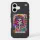 Vibrant, colorful design featuring a funny tarot card with a female skeleton. The skeleton has wild pink hair with flowers in it, a sugar skull face, and is holding a open book. The colorful text reads: "The bookworm". This design is available on a wide variety of products.