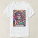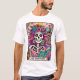 Vibrant, colorful design featuring a funny tarot card with a female skeleton. The skeleton has wild pink hair with flowers in it, a sugar skull face, and is holding an open book. The colorful text reads: "The bookworm". This design is available on a wide variety of products.