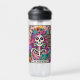 Vibrant, colorful design featuring a funny tarot card with a female skeleton. The skeleton has wild pink hair with flowers in it, a sugar skull face, and is holding a open book. The colorful text reads: "The bookworm". This design is available on a wide variety of products.