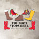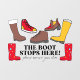 Remind the kids and their friends and your friends to take their boots off with this firm reminder and a play on words that the boot stops here. A fun mixture of different boots highlights your message.