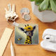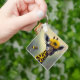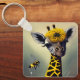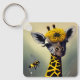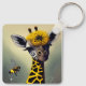 Cute keychain features AI generated surreal painting of a whimsical giraffe morphed with a bumblebee.