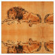 An extinct berber lion crouching,resting, pen and ink drawing from Dutch painter Rembrant Van Rijn late 1640s. Classic design in vibrant yellow orange brown black colors.