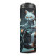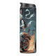 A Cat dressed in all white like a ghost driving a motorcycle through a spooky haunted town full of skeleton heads and ominous clouds.