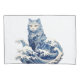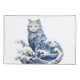 Elegant blue and white cat in the style of “The Wave Off Kanagawa” by the Japanese woodblock ukiyo-e artist Hokusai, especially for cat lovers.