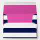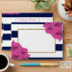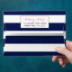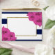 The chic modern luxe wedding collection features a classic navy blue and white stripe background accentuated with beautiful pink roses and a faux gold foil frame.
