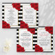 The chic modern luxe wedding collection features a classic black and white stripe background accentuated with beautiful ruby red roses and a faux gold foil frame.