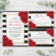 The chic modern luxe wedding collection features a classic black and white stripe background accentuated with beautiful ruby red roses and a faux gold foil frame.