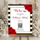 The chic modern luxe wedding collection features a classic black and white stripe background accentuated with beautiful ruby red roses and a faux gold foil frame. This welcome sign is easy to personalize and will be the perfect signage for any wedding, bridal shower, birthday party, engagement celebration or any other special occasion. The template wording and QR code is easy to personalize to make this sign unique to your special event.
