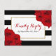 The chic modern luxe wedding collection features a classic black and white stripe background accentuated with beautiful ruby red roses.