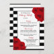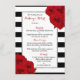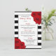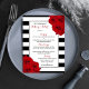 The chic modern luxe wedding collection features a classic black and white stripe background accentuated with beautiful ruby red roses and a faux silver foil frame.