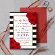 The chic modern luxe wedding collection features a classic black and white stripe background accentuated with beautiful ruby red roses and a faux gold foil frame.