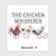 Funny sticker design for chicken lovers and farmers featuring watercolor illustration of chickens and a chick with a text that says "the chicken whisperer"