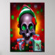 A skull with a green Christmas beanie on a red, yellow, green background and Christmas present in front of the skull. This is a AI generated art.