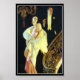 J. C. Leyendecker 1932 painting of a glamorous couple walking down a grand staircase dressed to the nines in evening attire.