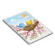 Keep a record of your most loving thoughts and the most brilliant ideas with this touching notebook. On the front is a fanciful, sketchy, crayon, drawn picture of two charming birds, one blue and one yellow, cooperating to make a snug nest among the flowering cherry blossoms.