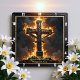 This incredibly powerful and inspiring design captures the theme of Divine Strength through unwavering faith. The artwork features a massive, dark Cross with a detailed central medallion, standing firmly on a rocky base and dramatically enveloped in brilliant, golden-orange flames and towering smoke clouds. A prominent clock motif with dark hands overlays the scene, reminding the observer of the eternal nature of this strength and the enduring power of faith. The design is presented with a high-quality, durable print that creates the striking illusion of a rich, dark wood grain frame surrounding the image, though this border is entirely a visual effect printed directly onto the clock face and is not a separate frame or real wood. The image contains the powerful Bible verse, "I can do all things through Christ who strengthens me. Philippians 4:13." This piece is a final, powerful reminder of Christian conviction.