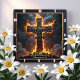 This incredibly powerful and inspiring design captures the theme of Divine Strength and unwavering victory through faith. The artwork features a massive, dark Cross inscribed with "THE CROSS," standing on a rocky base and dramatically enveloped in brilliant, golden-orange flames and huge, billowing smoke clouds, symbolizing the spiritual conviction that overcomes the darkest trials. A prominent clock motif with dark hands overlays the scene, reminding the observer of the eternal nature of this strength and the conquering power of belief. The design is presented with a high-quality, durable print that creates the striking illusion of a rich, dark wood grain frame surrounding the image, though this border is entirely a visual effect printed directly onto the clock face and is not a separate frame or real wood. The image contains the powerful Bible verse, "I can do all things through Christ who strengthens me. Philippians 4:13." This piece is an ultimate reminder of Christian conviction.