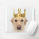 Yellow Labrador dog with a gold crown on its head, the crown is adorned with red, blue, and green jewels. The dog has dark eyes and a pink nose. The background is white.