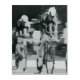 A hazy monochromatic, black-white-grey, image of two cyclists racing to the finish line