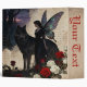 This binder looks like an illustration from a book of Grimm's Fairy Tales, with a dark fairy dressed in black standing next to a black wolf. Part of a dark forest scene, red and white roses, and illegible, faded text on old parchment completes the scene. Gothic esthetic, and perfect for anyone who loves fantasy, fairies, and fairy tales.