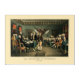 Hand colored print with interior scene showing some of the composers and signers of the Declaration of Independence. Drafting committee presenting their draft to the Continental Congress in 1776. Features John Hancock, John Adams, Benjamin Franklin, and Thomas Jefferson.