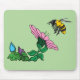 Two small flower bud sprites huddle together behind their mother as a large bee looms near. The parent flower sprite guards the little ones by presenting her fully bloomed flower to the insect.