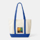Love the durable cream colored canvas and navy blue contrasted handles. Perfect for carrying my laptop and papers.