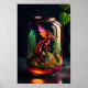 Magical poster print features a glass terrarium with a tiny dragon seated among nature elements. Digital art painting created using AI generating software.