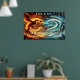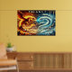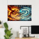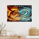In this epic fantasy scene, the dragons of fire and ice face off in a dramatic confrontation. The fire dragon, scales glowing like molten lava, dominates the smoky sky, surrounded by swirling flames. The ice dragon, shimmering in shades of blue and white, rises from a frozen, crystalline landscape, exhaling an icy mist. The background is a striking contrast of fiery hues and icy textures. The text "FIRE & ICE" appears at the Top