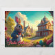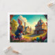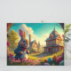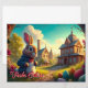 The motif shows a fairytale Easter landscape with an elegantly dressed rabbit in the foreground. He wears a blue jacket and sits on a path surrounded by colorfully decorated Easter eggs. A flowering arch frames the scene, which merges into an idyllic village with charming houses, a tower and a church. The warm evening sun bathes everything in golden light, creating a magical and mysterious Easter atmosphere. 🐰✨