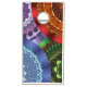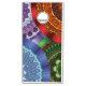 Water, fire, earth, and wind themed concentric circle mandalas come together in this colorful design. Each features a similar center and outer layer with the others being appropriate to the element.
