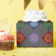 Water, fire, earth, and wind themed concentric circle mandalas come together in this colorful design. Each features a similar center and outer layer with the others being appropriate to the element.