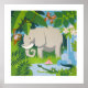 The elephant is the central character in a jungle tableau, surrounded by a monkey, a butterfly and a crocodile.