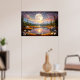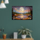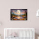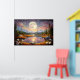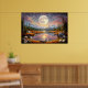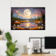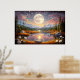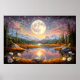 Contemplate the magic of a giant moon reflected in serene waters, surrounded by snow-capped mountains and a starry sky in pink and golden tones. This fantastic artwork transports you to an enchanted realm where dreams come true. Stunning digital art that brings peace, mystery, and cosmic beauty to your space.