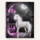 A majestic white unicorn stands gracefully on a stone platform framed by tall, gothic arches. Her mane flows gently, glowing faintly in the moonlight, while a soft halo of mist and magic curls around her. The unicorn’s horn shines with an ethereal light, casting a gentle glow across the dark, enchanted setting.