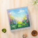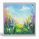 Vibrant abstract painting of a spring scene with a lush green meadow and blooming flowers in various shapes and colors. The sky is a mix of soft pastel shades with a few fluffy clouds scattered across it. The overall mood of the painting is cheerful and rejuvenating, capturing the essence of spring in its full bloom.