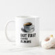This image features a minimalist esthetic with a centered, eye-level shot of a white coffee cup filled with dark coffee, resting on a matching saucer. The coffee shows a rich, frothy crema, suggesting a freshly brewed espresso or similar beverage. Below the cup, the text "BUT FIRST COFFEE ALWAYS" is displayed in a bold, stylized font, emphasizing the importance of coffee in the daily routine. The background is a solid, light gray, providing a clean and uncluttered backdrop that highlights the coffee and text.