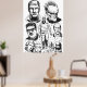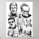 Black and white illustration featuring several iconic characters from the legendary Argentine comic "El Eternauta," including Juan Salvo in his protective suit, Elena, Martita, Favalli, and the fearsome Cascarudo. A tribute to the science fiction and adventure universe created by Oesterheld and Solano López.