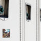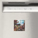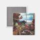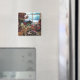 This photo is a picture of a feast laying out on a table. Light coming through the window shows ice on the window. A variety of vegetables, fruits and desserts are ready for the celebration. These magnets come in a variety of shapes and sizes.