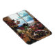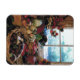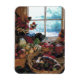 This photo is a picture of a feast laying out on a table. Light coming through the window shows ice on the window. A variety of vegetables, fruits and desserts are ready for the celebration. These magnets come in a variety of shapes and sizes.