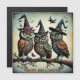 Scary but cute. A trio of owls wearing witch's hats; surreal style, an artificial-intelligence generated artwork, on a magnetic card for your Halloween pleasure. So seasonal! So stylish on your fridge!